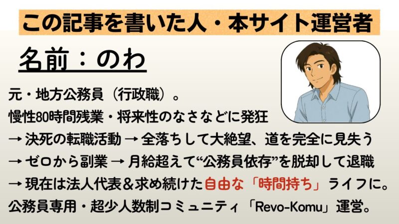 のわ 転職全落ちを経験した後、公務員在職中に月30~40万の不労収入を構築。 脱・公務員を達成後、現在の年商は2〜3000万ほど、法人2社代表。 公僕生活から自由を取り戻したのわと申します! >>詳しいプロフィールはこちら======!特集記事!======